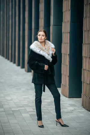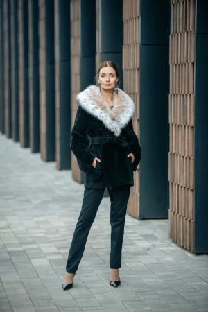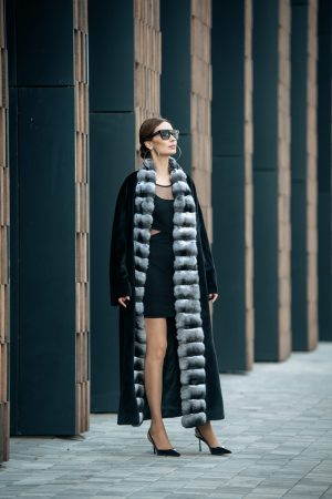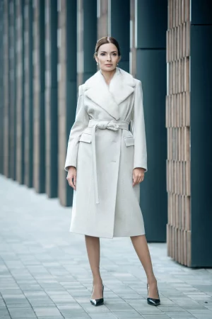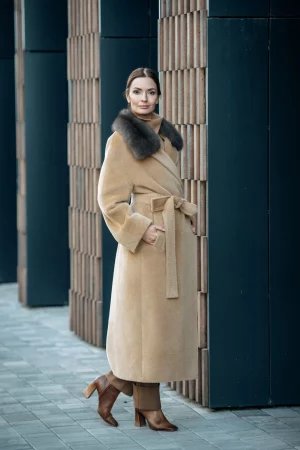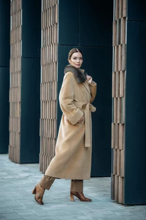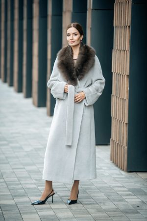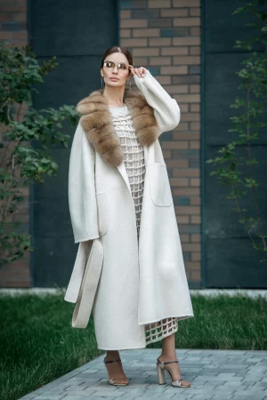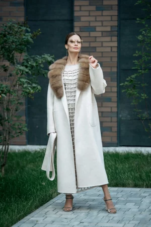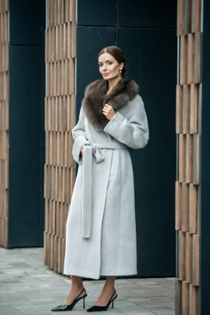 Пальто из шерсти мериноса с меховым воротом чернобурая лисица