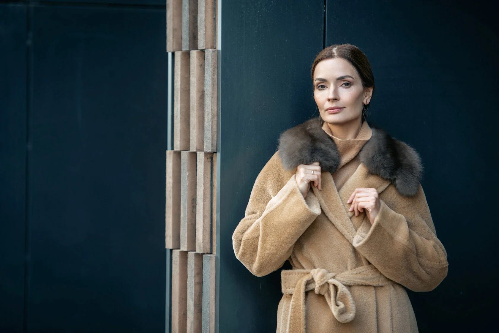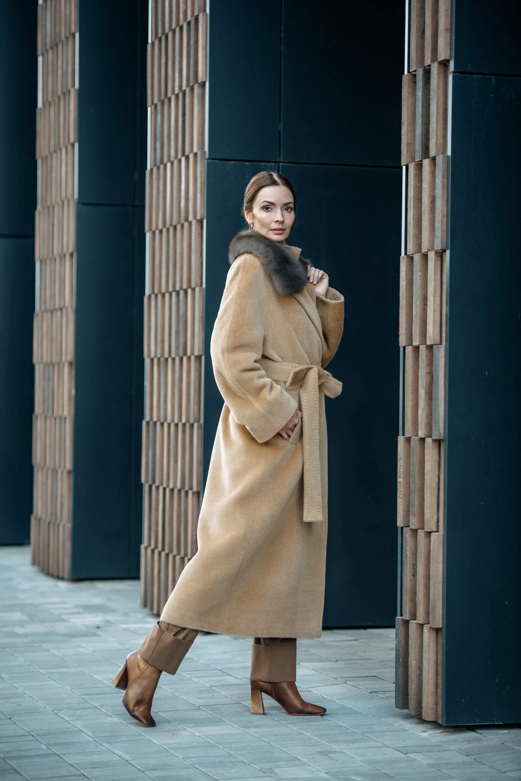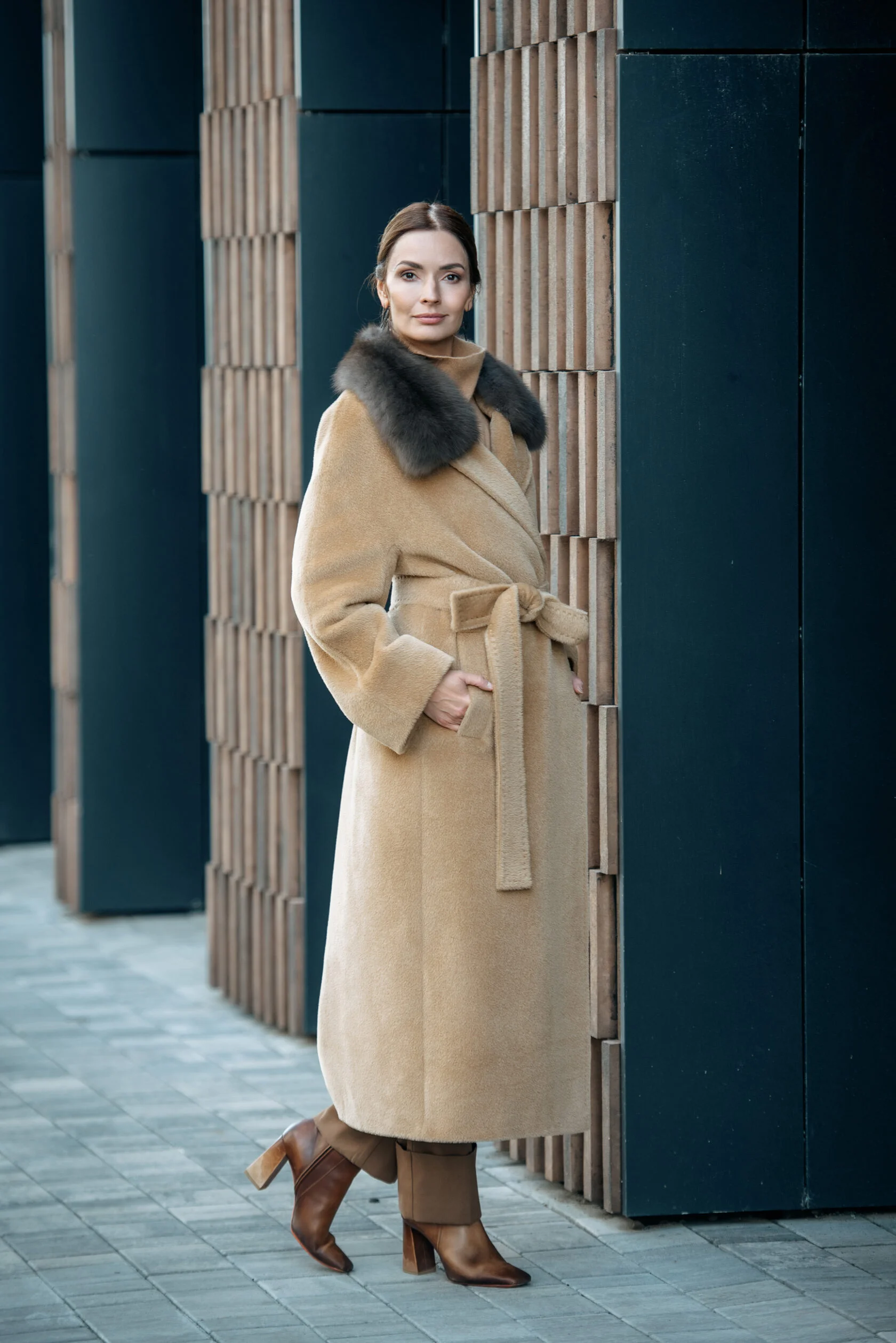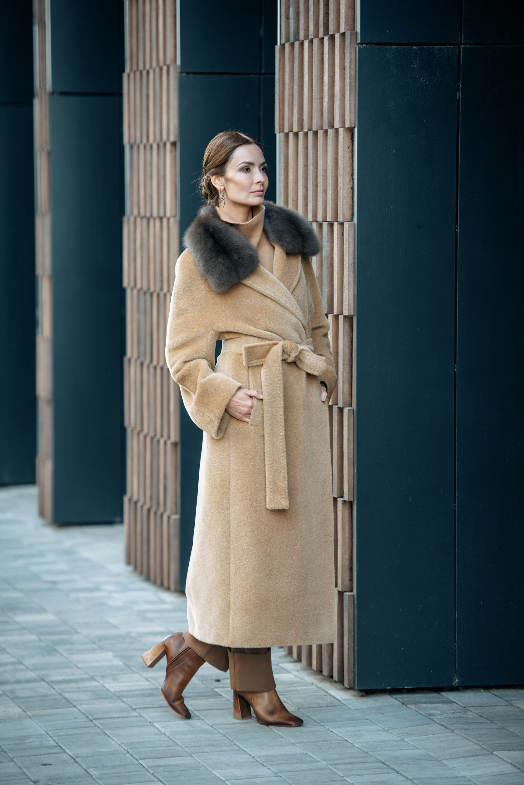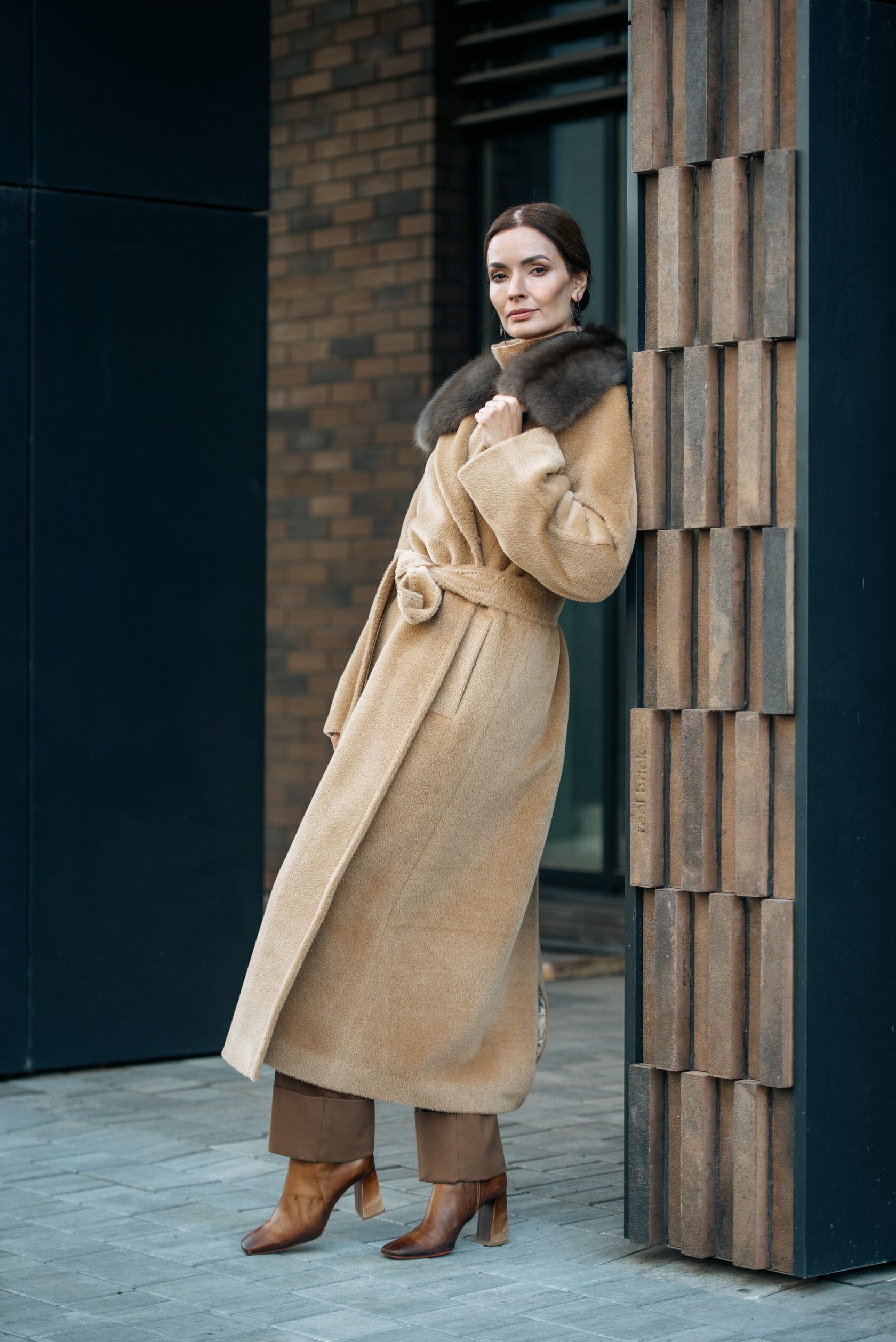 Купить пальто из шерсти сури альпака песок с воротом куница Вы можете по адресу: г. Москва, Сущевский Вал, д. 5, стр. 1 (м. Савеловская, ТК “Савеловский-Модный”, магазин “Меха и Мода”, D-136).