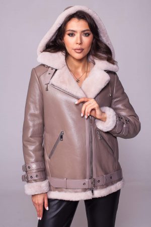 Дубленка модели бомбер с капюшоном и трикотажной отделкой