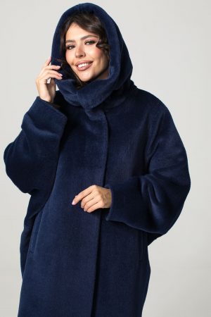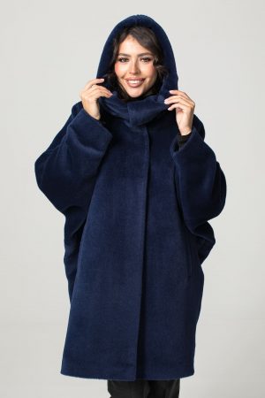 Пальто альпака модели кокон с меховой горжеткой и манжетами синего цвета