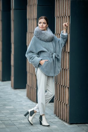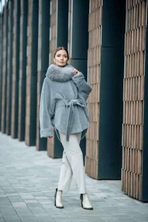 Пончо из шерсти Сури альпака с капюшоном отделка лисица